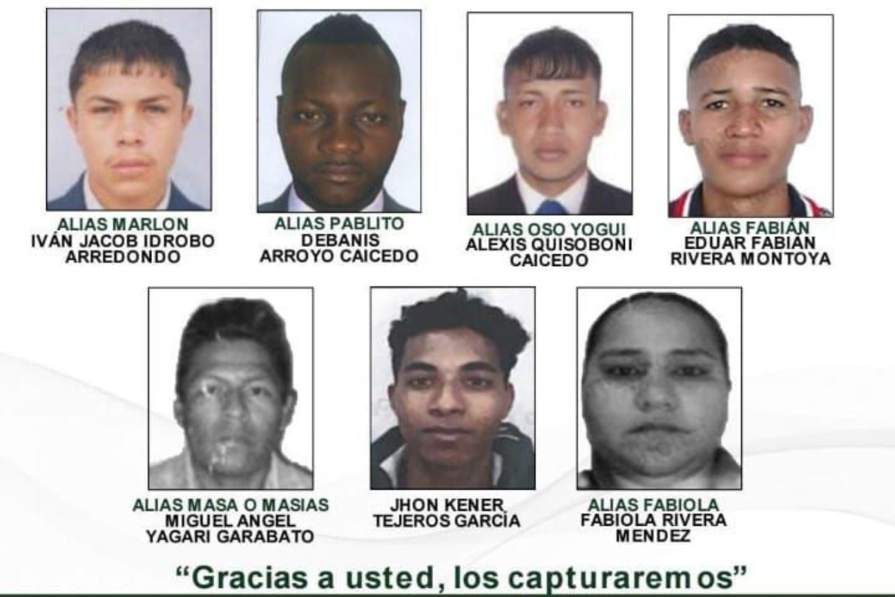 Los siete individuos identificados en el cartel son: alias Marlon (Iván Jacob Idrobo Arredondo), alias Pablito (Debanis Arroyo Caicedo), alias Oso Yogui (Alexis Quisoboni Caicedo), alias Fabián (Eduar Fabián Rivera Montoya), alias Masa o Masías (Miguel Ángel Yagari Garabato), Jhon Kener (Tenorio García) y alias Fabiola (Fabiola Rivera Méndez).