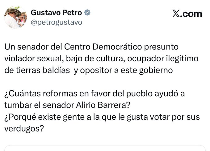 A través de su cuenta en X, el mandatario calificó a Barrera como “presunto violador sexual, bajo de cultura, ocupador ilegítimo de tierras baldías y opositor a este gobierno”, en una publicación que generó reacciones inmediatas en el escenario político nacional.