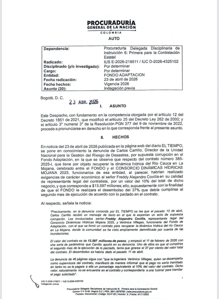El auto de indagación, radicado el 23 de abril de 2026 con número IUS E-2026-219511, fue proferido por la Procuraduría Delegada Disciplinaria de Instrucción 6, Primera para la Contratación Estatal, con base en una denuncia conocida públicamente el mismo día.