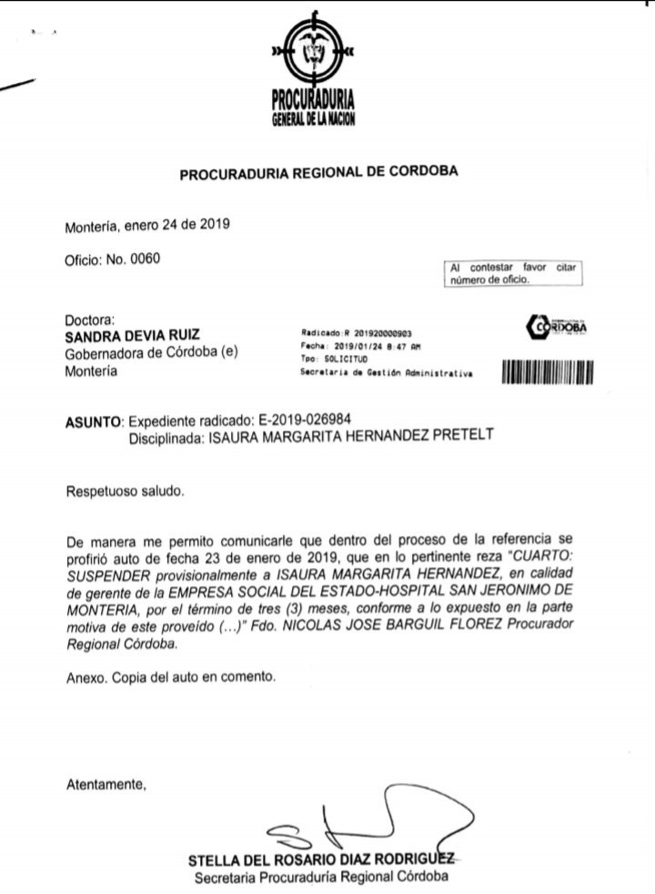Montería. Este jueves 24 enero se conoció un proveído de la Procuraduría Regional de Córdoba, donde se hace referencia a una nueva suspensión contra Isaura Hernández Pretel, gerente del hospital San Jerónimo de Montería.