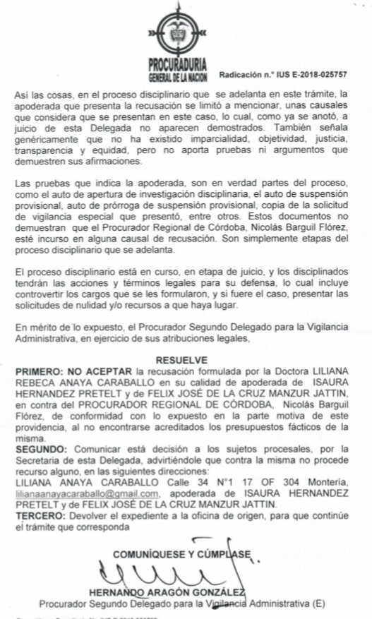 La funcionaria fue nuevamente suspendida por un período de 3 meses por parte del Ministerio Público. Se conoció además que Isaura Hernández a través de su apoderada, pretendió recusar al procurador regional de Córdoba Nicolás Barguil, pretensión que fue rechazada.