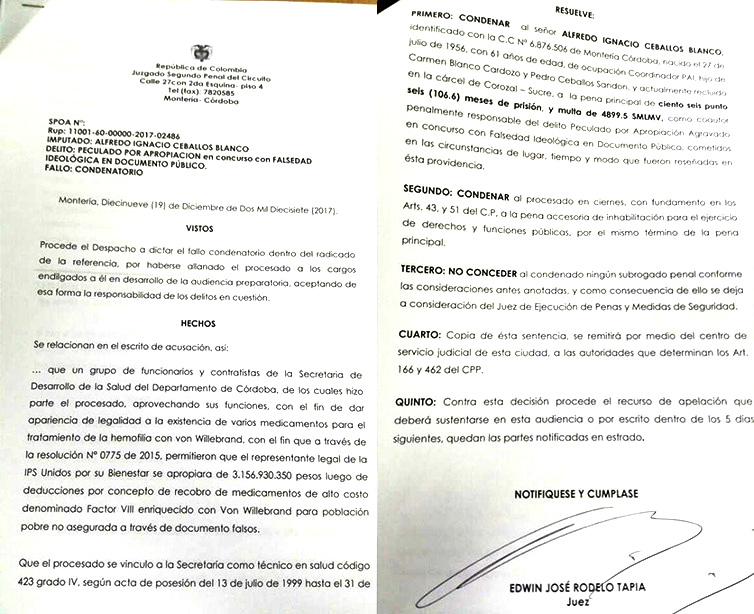 El fallo condenatorio contra el ex funcionario de la Secretaría de Salud de Córdoba, investigado por el denominado ‘Cartel de la Hemofilia’, fue proferido por el Jueves Segundo Penal del Circuito de Montería.