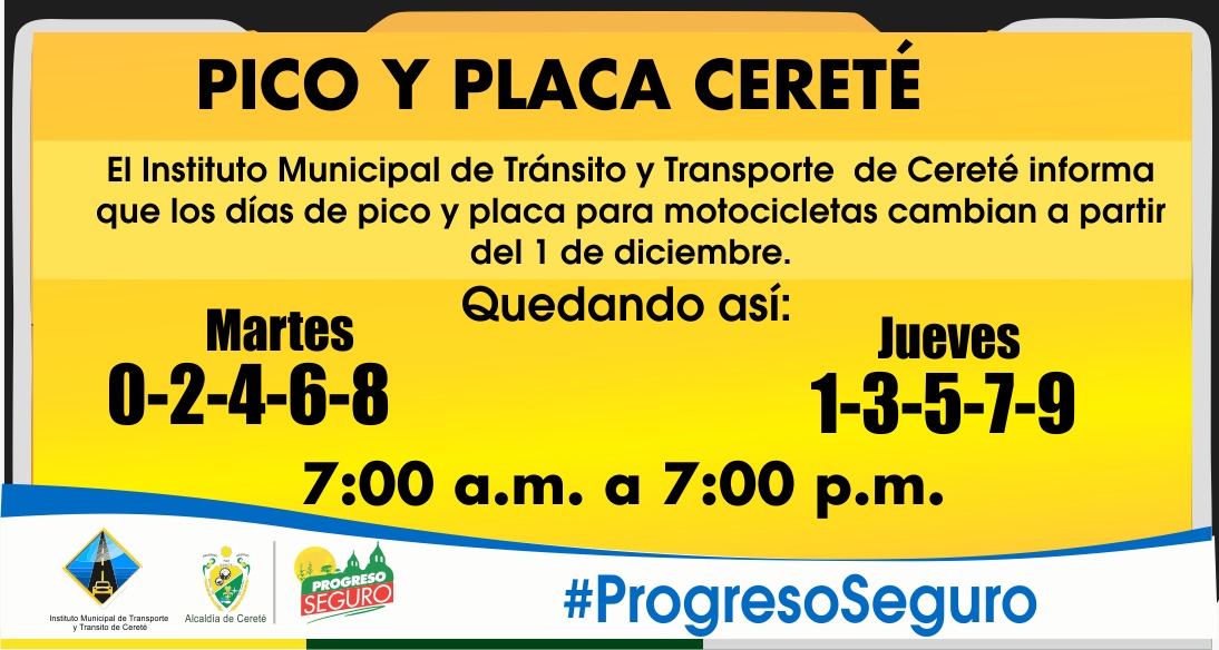 Desde el Instituto Municipal de Tránsito y Transporte de Cereté (IMTT) se informó que a partir del próximo viernes 1° de diciembre, cambiarán los días de Pico y Placa para Motocicletas, quedando de la siguiente manera: