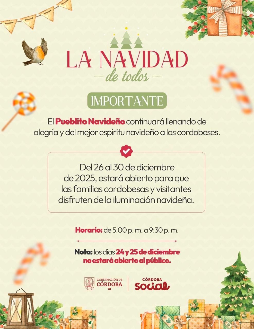 La Gobernación de Córdoba informó que el Pueblito Cordobés no estará abierto al público los días 24 y 25 de diciembre, correspondientes a Nochebuena y Navidad, como parte de la programación de “La Navidad de todos” que se desarrolla en el departamento.