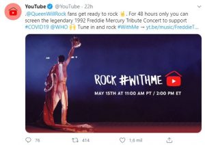 Queen anunció que transmitirá durante 42  horas el histórico evento a través de su cuenta oficial de YouTube para que las personas disfruten de aquel inolvidable y conmovedor homenaje. Los integrantes de la banda: Brian May, John Deacon y Roger Taylor interpretaron sus clásicos y, además, contó con la participación de artistas como David Bowie, Axl Rose, George Michael, Elton John, Roger Daltrey, entre otros. Además, del discurso de Elizabeth Taylor, con el que buscó crear conciencia sobre las enfermedades de transmisión sexual.