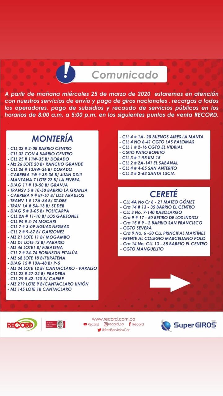 Por lo anterior, la empresa Record habilitó en Córdoba 114 de sus 800 puntos de servicio, para el envío y reclamo de giros, recarga a celular, pagos de servicios públicos y cobro de los diferentes subsidios y apoyos estatales.