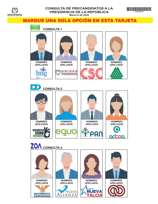La Registraduría Nacional del Estado Civil presentó el formato de la tarjeta electoral que se utilizará en las consultas para la escogencia de candidatos a la presidencia de la República, que se realizarán el 8 de marzo de 2026.