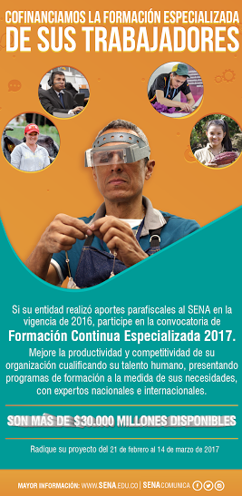 A partir de hoy 21 de febrero y hasta el próximo 14 de marzo a las 10:00 de la mañana, el SENA tiene abierta la convocatoria pública de Formación Continua Especializada, con más de 30 mil millones de pesos para cofinanciar proyectos de formación a la medida de las necesidades de los empleados vinculados a las empresas que actualmente aportan parafiscales a la Entidad.