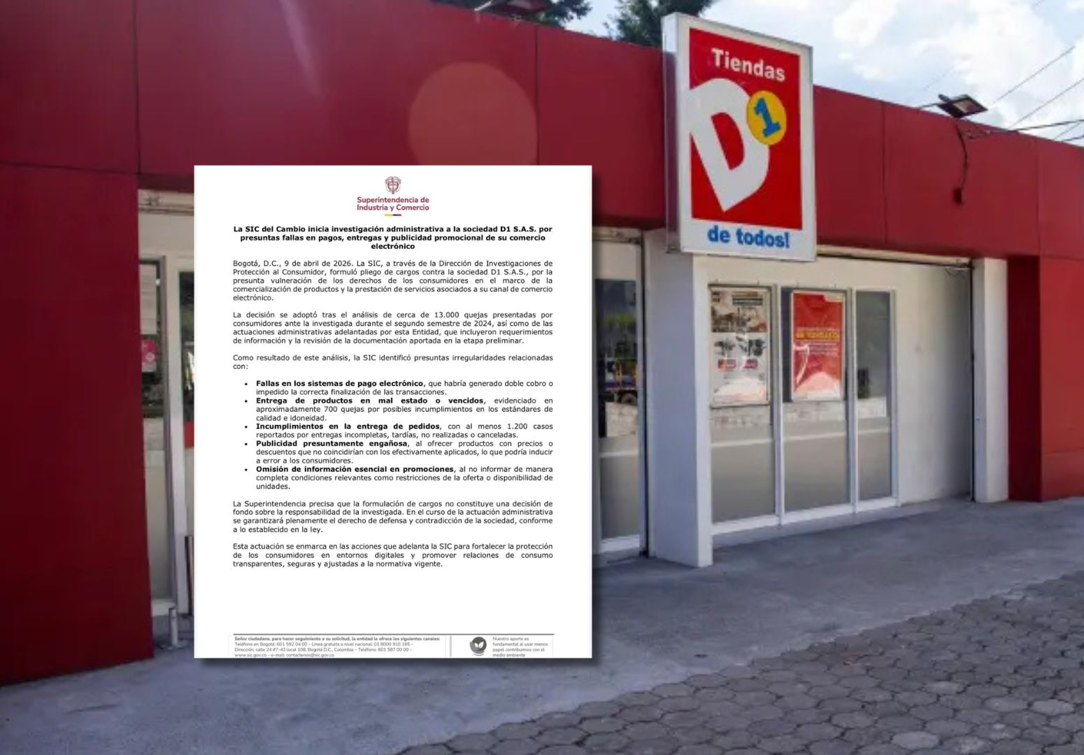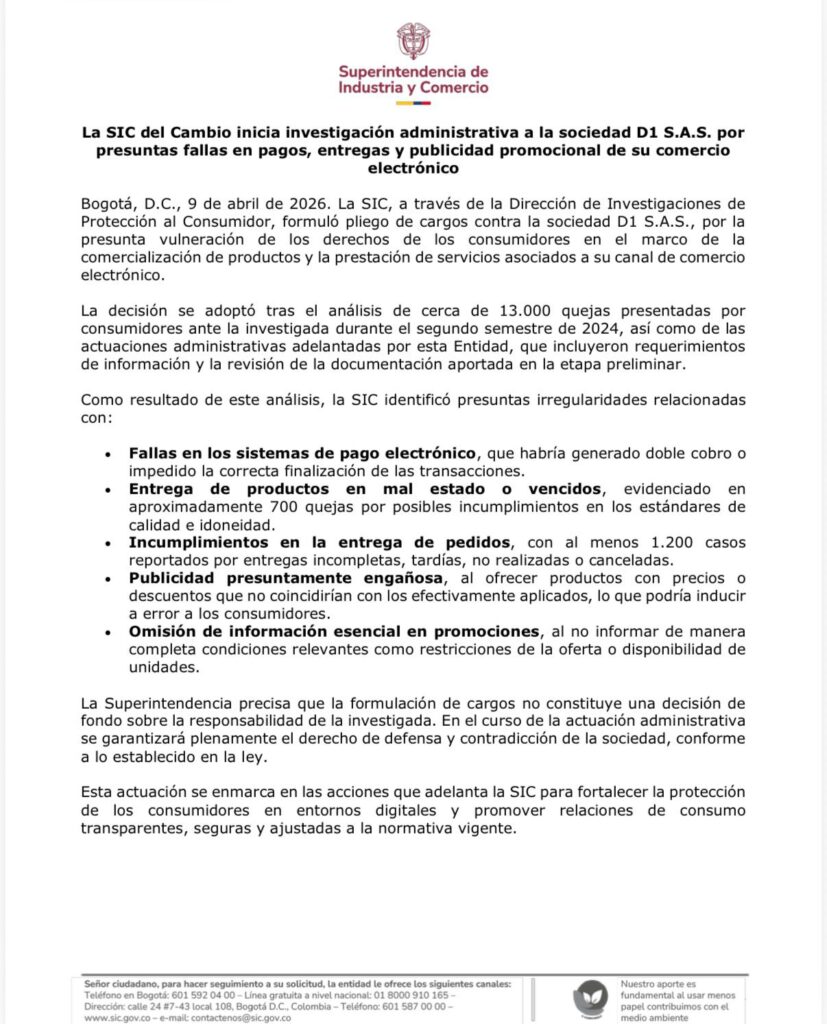 La Superintendencia de Industria y Comercio (SIC) formuló pliego de cargos contra la sociedad D1 S.A.S. por presuntas vulneraciones a los derechos de los consumidores en su canal de comercio electrónico, tras analizar cerca de 13.000 quejas presentadas y revisar las actuaciones administrativas adelantadas en la etapa preliminar de la investigación.