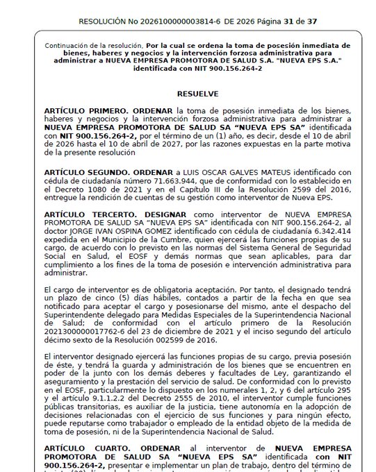 La resolución también ordenó a Luis Oscar Galves Mateus a la rendición de cuentas de su gestión como interventor saliente de la Nueva EPS, en cumplimiento de lo establecido en el Decreto 1080 de 2021 y la Resolución 2599 de 2016.