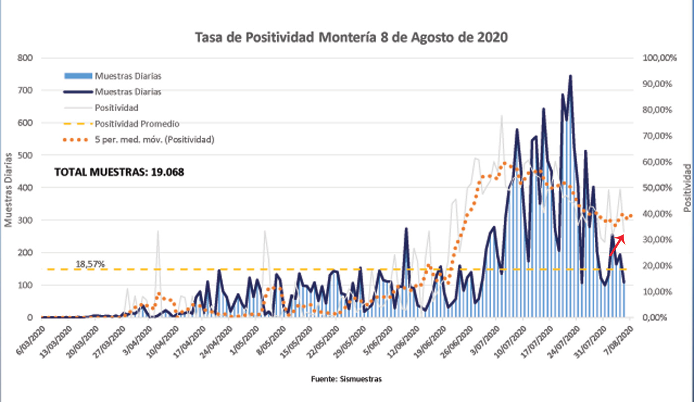 Dicha tasa establece el porcentaje de test positivos sobre el total que se realizan. Montería venía manejando a marzo de 2020 una positividad por debajo del 10%, sin embargo, al llegar julio subió a niveles del 40%.
