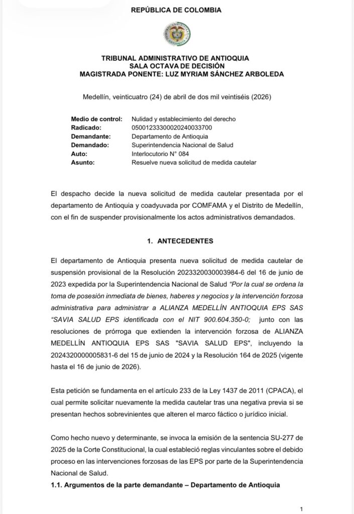 La decisión, contenida en el Auto Interlocutorio N° 084 con ponencia de la magistrada Luz Myriam Sánchez Arboleda, resuelve una nueva solicitud de medida cautelar presentada por el departamento de Antioquia y coadyuvada por Comfama y el Distrito de Medellín, orientada a suspender los actos administrativos que sostienen la intervención de la Supersalud sobre la EPS.