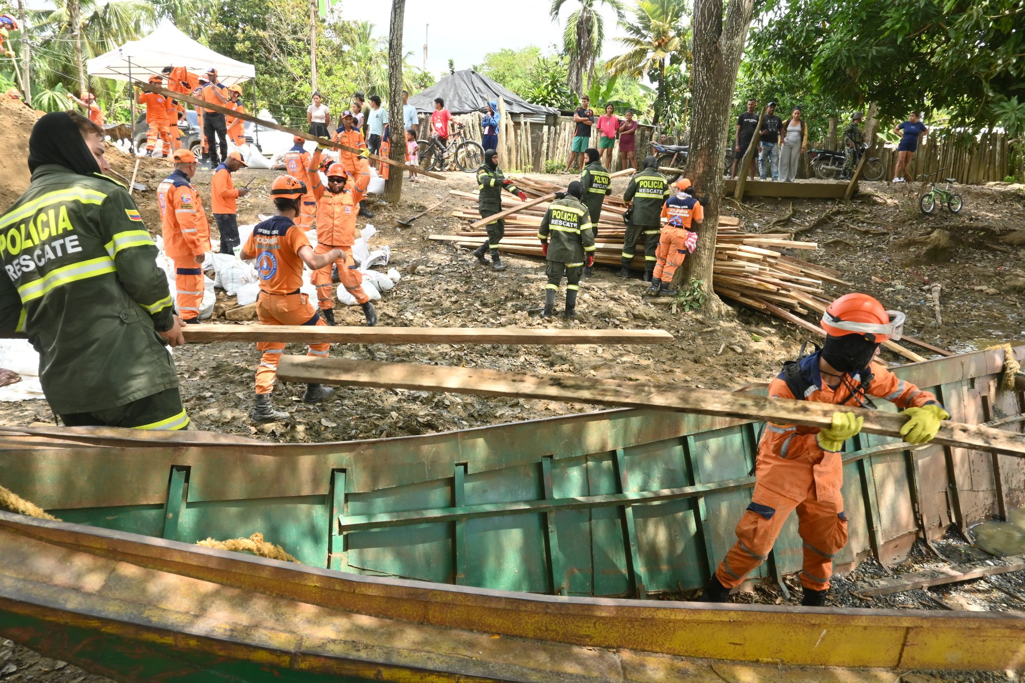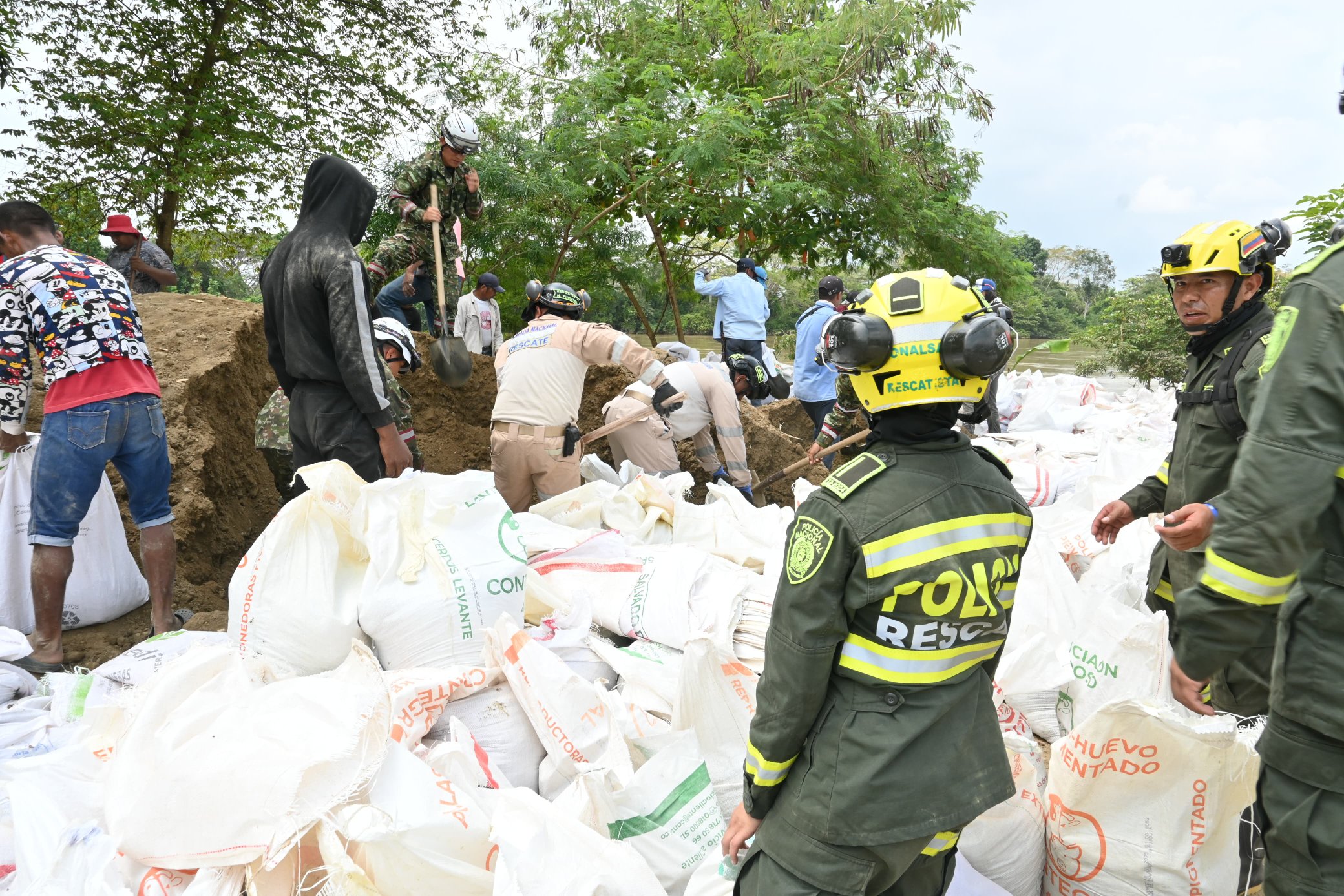 Hombres de la Defensa Civil, Armada Nacional, Policía Nacional y Ejército de Colombia se sumaron a las labores de llenado de sacos, así como el traslado de personal hasta el punto crítico para levantar el jarillón.