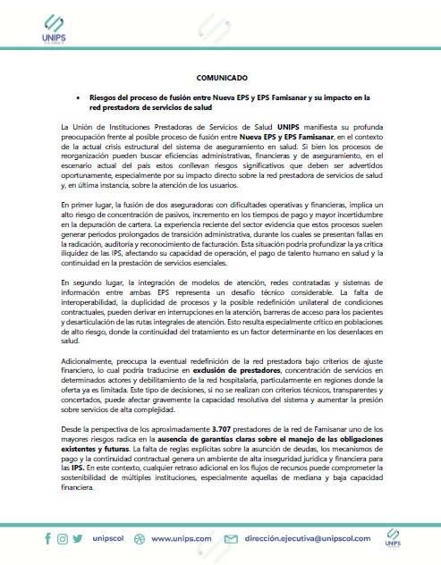 La Unión de Instituciones Prestadoras de Servicios de Salud, UNIPS, expresó este martes su profunda preocupación frente a la posible fusión entre la Nueva EPS y EPS Famisanar, y advirtió que ese proceso, de no manejarse con transparencia y criterios técnicos claros, podría generar consecuencias graves para la red prestadora de servicios de salud y para los pacientes en todo el país.
