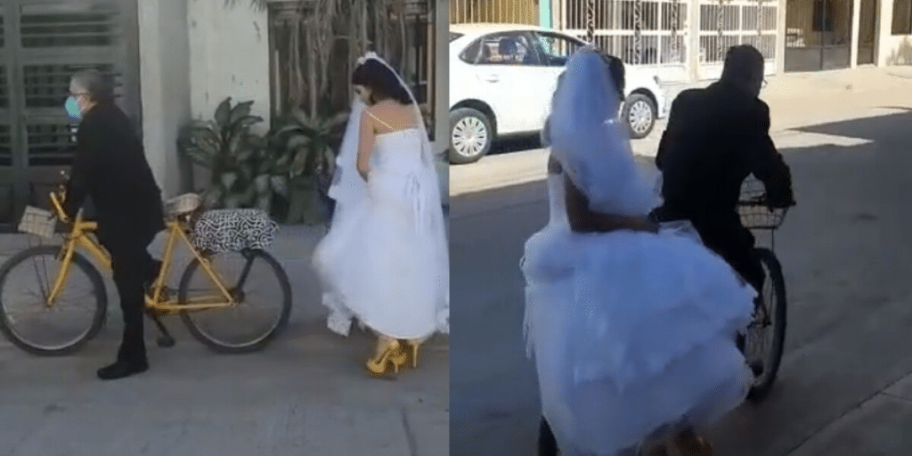 #Viral| Un video publicado en la plataforma de videos TikTok se ha hecho viral, en el tierno video aparece un padre llevando a su hija vestida de novia al altar en bicicleta. La joven se ve sentada en la parte trasera del vehículo, mientras este conduce con un elegante traje negro.