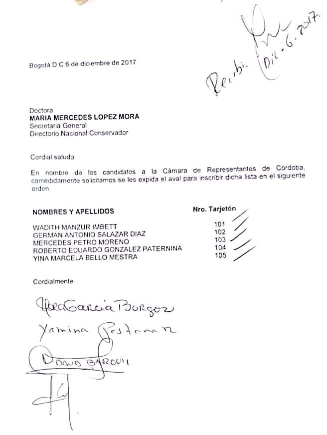 Los otros nombres que integran la lista conservadora la cámara de representantes en Córdoba son el de Germán Antonio Salazar Díaz, Mercedes Petro Moreno, Roberto Eduardo González y Yina Bello Mestra.