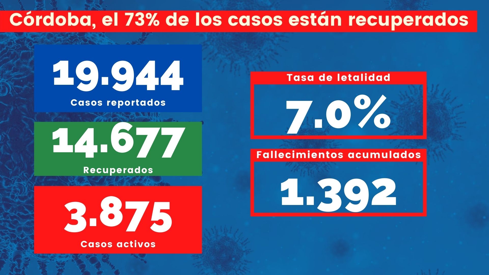 Córdoba tiene a corte del martes 01 de septiembre 19.944 contagios positivos, 14.677 de esos están recuperados lo que representa el 73% de los casos.